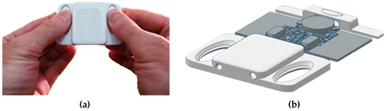 Mobile ECG sensing extender, usage and design by ECG for everybody: (a) its size compared with the fingers; (b) its interior with the plastic cover removed.