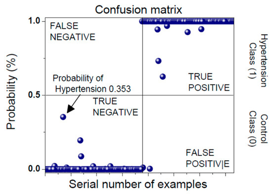 The classification results are presented in a form of a confusion matrix (Figure 7). Prediction classes are labeled as Negative (Healthy Control) and Positive (Hypertension). The model is built according to the training data set. A test set exhibits one of the four outcomes: True Negative, False Negative, True Positive and False Positive. An established model enables the evaluation of a Positive outcome probability for every incoming signal. An example in Figure 7 shows the probability that the input data belongs to a patient that is in a hypertensive state is equal to 0.353. This subject currently belongs to the healthy class, but with a high risk of entering a hypertension state, so he/she should decrease his/her activities.