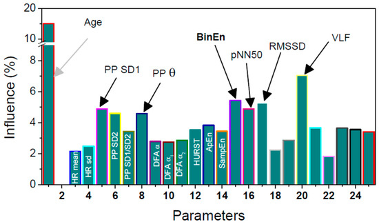 An influence of parameters considering the subject classification. The parameters with significant influence are labelled in black. Parameters 19–25 are related to the power spectral density. Parameter 18 is Total power (sum of the power spectral density components).