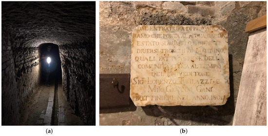 (a) A view of one of the “Bottini” galleries and (b) one of the historical inscriptions.