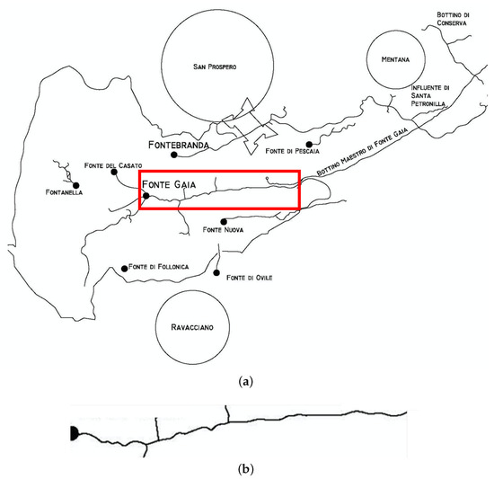 The so-called “Bottini” are the medieval aqueducts that still feed the most part of the historic fountains in the Centre of the City of Siena, Tuscany, Italy. They are constituted by a series of galleries dug below the centre of the city and its close neighborhoods (see Figure 1a). The whole network is around 25 km long, and is composed of two main branches named “Bottino Maestro di Fonte Gaia” and “Bottino Maestro di Fontebranda” (from the names of the two monumental fountains respectively fed by the two branches) and a large number of secondary channels of different lengths. The structure was built from the XIII to the XV century and it is still perfectly preserved in its central sections while it is affected by different levels of degradation in the peripheral portions.