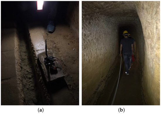 The data transmission range was first tested outdoor in an urban environment. In this case, a transmission range of around 3 km was experienced: this value is in line with the ideal performances expected for the system. In a second step, we carried out experiments in the “Bottini” scenario. For this purpose, a section of around 500 m length of the so-called “Bottino Maestro di Fonte Gaia”, i.e., the gallery bringing the water to the fountain in the main square of the city (“Piazza del Campo”), was chosen. Figure 2a shows the network of galleries below the city centre while Figure 2b highlights the chosen section. It is worth noting that, while the gallery runs along a single direction (from south to north), the path is not perfectly straight. Several small curves prevent from having line-of-sight for more than 20–30 m.