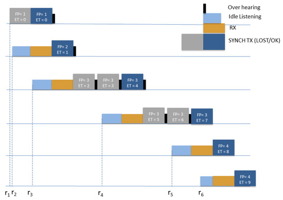 Figure 6 sketches the flow of the SYNCH packets for the first 6 nodes following node 1, underlining the increase in the FP and ET values with the progress of the synchronization. In the Figure the wake-up times and the correspondent different nodes’ modality, namely, idle listening, SYNCH and data packets reception (RX), SYNCH packet transmission (SYNCH TX) and overhearing are reported.