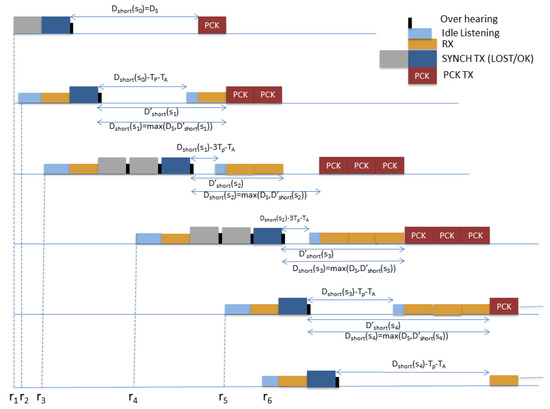 Figure 7 sketches the flow of the DATA packets for the first 6 nodes following node , referring to the synchronization phase reported in the example of Figure 6. In the Figure the correspondent different nodes’ modality, namely, idle listening, data packet transmission (PCK TX) and overhearing are reported.