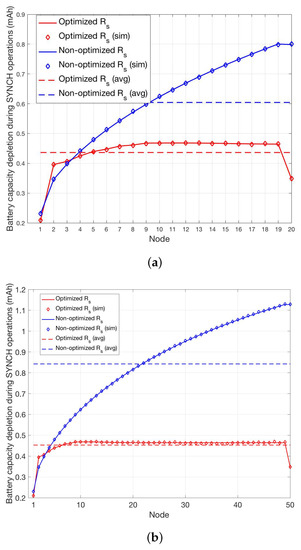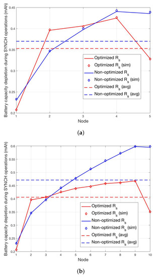 The cases and are shown in Figure 8a,b, while the cases and are shown in Figure 9a,b. In all cases, we report the per-node and the average battery capacity depletion during SYNCH operations for the optimized and non-optimized schemes. In order to definitely assess the validity of the analysis, we have also carried out a simulator that implements the proposed SYNCH and DATA protocols depicted in Figure 7. The average battery capacity depletion during SYNCH operations obtained through simulations, reported as diamond markers in Figure 8a and Figure 9b, show a perfect matching with the analysis.