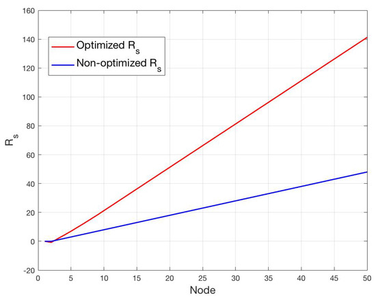 In order to better highlight the lagging-behind effect in the non-optimized case, we report in Figure 10 the optimized and non-optimized for . It can be observed that the optimal increases more than linearly, and the difference between the optimal and non-optimal increases with the node order. As further consideration, it is worth noting that the optimization scheme will inevitably increase the time needed for achieving synchronization, that is not however a critical parameter in the scenario at hand.