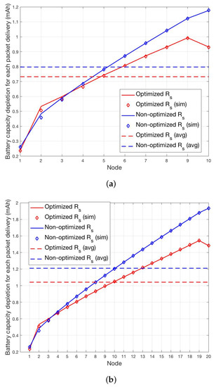 Per-node and average total battery capacity depletion for the optimized and non-optimized schemes for (a) and (b).