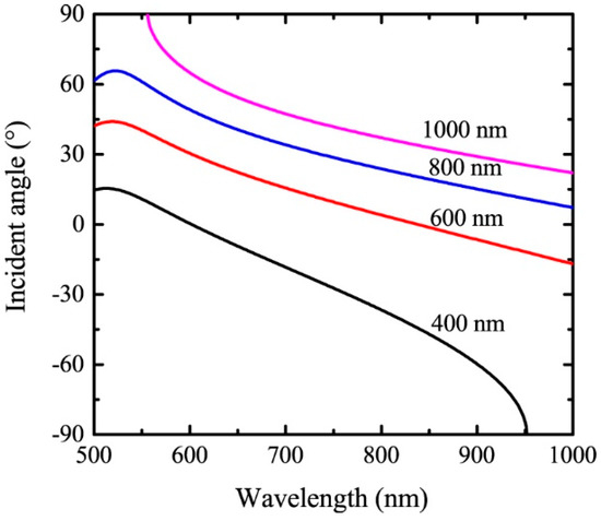 Here, we take particular concerns in the spectra range of 500 to 1000 nm, where high-performance silicon detectors are applicable. Assuming that the material of the metal grating is Au and the refractive index of the analyte is 1.34, the incident angle to excite SPR is calculated as a function of the resonant wavelength for four different grating periods of 400 nm, 600 nm, 800 nm, and 1000 nm for the first diffraction order. The results are shown in Figure 2. Generally, the angle decreases with increasing wavelength. Due to the constraint of , SPR cannot be excited at long wavelengths for P = 400 nm, as well as short wavelengths for P = 1000 nm.