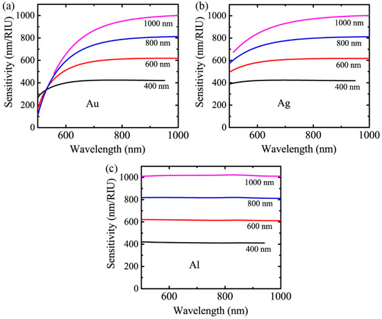 By substituting using Equation (7) and using Lorentz-Drude model into Equation (5), the value of the sensitivity can be calculated. Figure 3 shows the calculated sensor sensitivity versus the wavelength for grating periods of 400 nm, 600 nm, 800 nm, and 1000 nm with system parameters of , . The materials for the gratings in Figure 3a–c are Au, Ag, and Al, respectively.