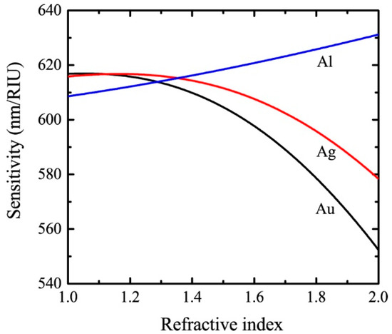 The dependence of the sensitivity on the refractive index of the analyte in the range of 1 to 2 is depicted in Figure 4. In the calculations, the grating period and the resonant wavelength are assumed to be 600 nm and 800 nm, respectively. As can be seen, S decreases with increasing for Au and Ag, while increases with increasing for Al. Since the real parts of the dielectric constants of these metals are negative, both the numerator and the denominator in Equation (5) increase with the refractive index of the sensing medium. The dependence of sensitivity on the refractive index is a result of the competition between the increasing speeds of the numerator and the denominator.
