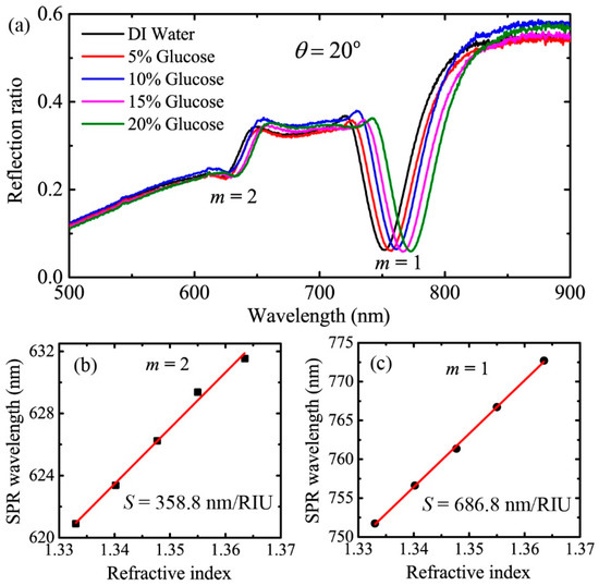 In order to further demonstrate our theoretical analysis, we experimentally measured the sensitivity of an Al grating-based sensor over a large wavelength range. The experimental setup is basically the same as that sketched in Figure 1. Detailed information of the setup can be found in our previous paper [35]. The grating was obtained by peeling off the metal layer from a SONY brand Digital Versatile Disc-Recordable (DVD-R) disc manufactured by Sony corporation in Taiwan, China. Here, the grating period and the modulation depth were 720 nm and 77 nm, respectively, according to the atomic force microscope image. Gratings fabricated by other two companies, namely Unisplendour corporation limited-company (UNIS) and the ANV series of Riteck corporation (ANV), were also measured. The grating periods for UNIS brand DVD-R disc made in Jiangsu, China and ANV brand DVD-R disc made in Taiwan, China were 724 nm and 727 nm. The modulation depths were 86 nm and 90 nm. As can be seen, the grating parameters of all the discs were similar. Gratings obtained from DVD-R discs of different manufacturers were proved to excite high quality SPR, and they were suitable to be applied in SPR sensors. In addition, the metal gratings fabricated by our method is stable for a long period of time. SPR response was measured for gratings stored in ambient conditions for more than 2 months. Deionized (DI) water and glucose solutions with concentrations of 5%, 10%, 15%, and 20% were used as the analytes. For instance, the reflection spectra measured at the incident angle of are shown in Figure 5a. As can be seen, there are two absorption dips in the spectra. The deep resonance at the wavelength around 760 nm was caused by the excitation of SPR for the first diffraction order, and the shallow one around 625 nm was caused by SPR excitation for the second diffraction order. Extracting the SPR wavelengths from the reflection spectra, we can plot the SPR wavelength as a function of the refractive index of the analyte. The results are shown in Figure 5b,c, where the wavelength is linearly dependent on the refractive index. The sensitivities are then obtained by linearly fitting the experimental data. Therefore, for , the experimental sensitivities are 686.8 nm/RIU and 358.8 nm/RIU for m = 1 and m = 2, respectively.