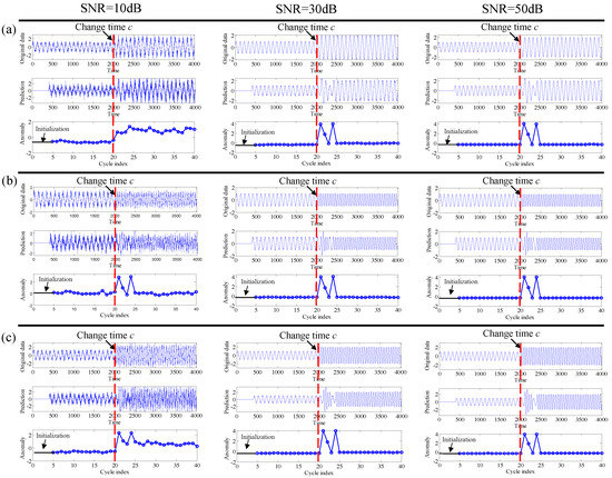 where c is the change time, m is the length of data, and is set as . The results are given in Figure 1, where the Figure 1a–c shows the simulated signals generated by Equations (11)–(13), respectively. For each subfigure, the SNR are set as 10, 30 and 50 dB, respectively. It can be clearly seen that the anomaly scores are stable before the status change, and then the occurrence of status change causes an abrupt increase of the anomaly score, which implies that it can be detected successfully. Here, we also found that, for amplitude change and amplitude and frequency change cases, the residuals of 30 dB and 50 dB are different from the one of the case 10 dB. The main possible reason is that, with a lower SNR, i.e., 10 dB, the noise will be more taken into account for prediction of the future value with an amplitude change; however, with a higher SNR, the noise will have less influence on the perdition process.