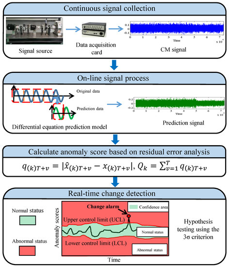 In this paper, we extend the work of [26] and present a new prediction model with the purpose of monitoring and diagnosing the running status for a considered machine. The baseline of the presented method is an early change detection using a differential equation (DE) based prediction model. This model can describe dynamic properties of a system which change with time quite well and can predict the future status of the system conveniently [27,28]. Moreover, it has been also proven more powerful when discovering of sciential laws for dynamic systems [27]. The DE model has been successfully used in many fields [29,30,31,32]; however, to the best of our knowledge, it is the first time to apply it to machine running status monitoring. In this paper, together with the DE model, an analysis of continuous monitoring of CM signals by means of a null hypothesis testing is proposed to inspect/diagnose whether an abnormal running status change occurs or not in successive machine operations.