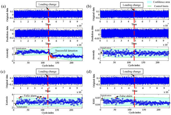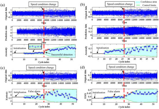 Figure 6 shows an example of change detection for a speed change from 350 rpm to 400 rpm, where the change is labeled by a human instructor. From Figure 6a–d, we show the detection result by our method, ARIMA model, Kurtosis and RMS. It can be seen that our method can successfully detect the change cycle. As seen in Figure 6a, the anomaly sores show a remarkable increase at the change time such that the change was detected successfully. However, the method using the ARIMA model did not detect any alarm because the anomaly score is always in the confidence area, as shown in Figure 6b; the detected change cycle using the Kurtosis and RMS is much earlier than the actual change cycle, which is attributed to false detection, as seen in Figure 6c,d.