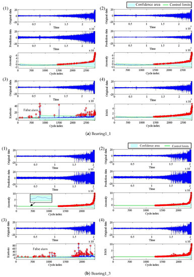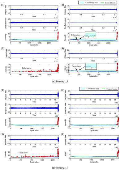 Figure 4 shows detection results of the four bearings with different methods. From the original data of each Figure 4a,b, we can see that the vibration amplitude of bearing 1 and bearing 2 have gradually increasing trends, which indicates that the failure gets severe gradually. On the contrary, the vibration amplitude of bearing 3 and bearing 4 increases sharply at the end of lifetime as seen in the original data of each Figure 4c,d, which means a quick degradation processes. Table 3 gives the specific comparison results accordingly, where the number in the table represents the first early failure alarm point, and “N/A” represents false detection status change because there are too many alarm points and the first alarm point is far earlier than the early failure point. Thus, it can be clearly seen that kurtosis fails to distinguish the normal and the abnormal states, which can be verified by subfigure (3)s in all subfigures a, b, c and d in Figure 4. In addition, for bearing 3, as shown in subfigure (c), ARIMA and RMS have false alarms in a normal state. To summarize, the detection performance order is: our method > RMS > ARIMA > Kurtosis, revealing that our method has a superior ability compared to the others.