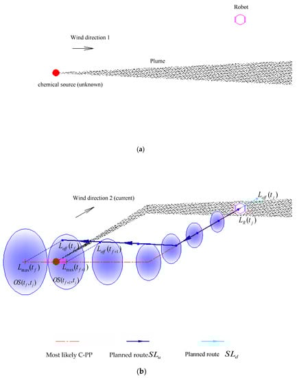 Research into the use of one or more mobile robots equipped with odor/gas sensors (in some research also with wind sensors) to search for chemical source(s) was called odor source localization (OSL) [,]. To make the OSL research more general, here we call it chemical source searching (CSS for short). The research into CSS can be roughly classified into behavior-based methods and analytical-model-based methods [], with most works focusing on behavior-based methods. A behavior-based CSS procedure can commonly be decomposed into three subprocedures (namely, plume finding, plume traversal, and source declaration), according to Hayes et al. []. During the plume finding subprocedure, the robot tries to make contact with the chemical plume. Only a few publications have discussed plume-finding methods. Hayes et al. [] proposed an initial outward spiral search pattern for plume finding. Recently, Marjovi et al. [,] discussed the optimal spatial configuration of swarm robotic gas sensors for plume finding. Once the plume is detected, the robot will switch to the second subprocedure, and begins tracing the chemical toward its source. Most methods for this subprocedure are biologically inspired, such as the gradient-following algorithms [,,,], the zigzagging algorithms [,], the upwind algorithms [,], adapted ant colony optimization algorithm [], particle swarm optimization algorithm and its variants [,,,], the SPIRAL algorithm [], and genetic programming algorithm []. During the plume tracing procedure, how to re-contact a lost plume is also an important issue []. In the final phase, the robot locates the source [,].