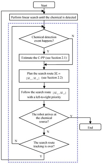 The proposed CSS is an iterative procedure, and its details are shown in Figure 3. The linear search described in Russell et al. [] is adopted by the robot to find chemical clues, whereby the robot travels at an angle of 35° with respect to the upwind direction. To make the robot move smoothly in the chemical-clue-finding phase, we use the current short-time-average airflow direction as the reference of wind direction. When the robot moves near the boundaries of the search area or encounters an obstacle, it will turn back and make another linear search. When a chemical-detection event occurs, the robot switches to the ERP method to trace the two parts of the newly planned route with a left-to-right priority. It is worth noting that the search route will be updated at each time step according to the short-time-average airflow direction determined by Equation (12), so the route tracked by the robot is time-varying.