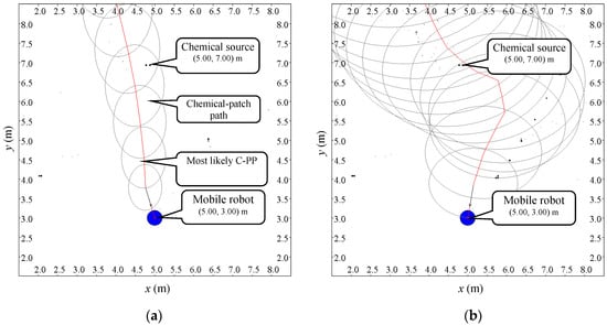 Figure 6 illustrates two of these estimated C-PPs when the distance between the robot and the source was 4 m and the threshold was m−2. In Figure 6, the ellipses mark the boundaries of areas in Equations (5) and (6). It is found that when the variance of airflow velocity decreases (i.e., the airflow is more stable, see Figure 6a), the estimated C-PP becomes more concentrated in its spatial distribution and the most likely C-PP becomes straighter.