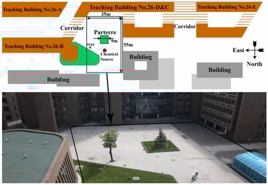 Plan sketch (upper) and picture (lower) of the experimental field for the O group. The trials of the O group were conducted in the small square (limited to 35 m × 55 m) on the north of Teaching Building No. 26-D&C, and there is a small garden standing about 0.4 m above the ground.