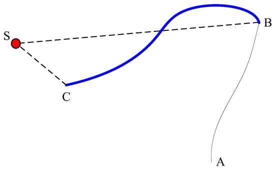 Sketch of the approaching effectiveness definition. The trajectory from A to B indicates the chemical-clue-finding phase, and B to C belongs to the plume tracing / traversal phase. The red point S stands for the chemical source. For our research, the plume tracing / traversal phase corresponds to the odor source searching with the ERP method and might include the chemical-clue-refinding phase.