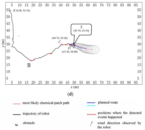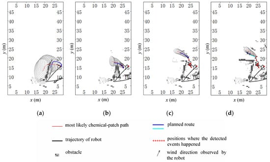 Figure 9 shows four scenes corresponding to four different times in one trial of this group, where the chemical source was located at S (49.70 m, 29.30 m). During this CSS process, the wind speed ranged from 0.69 m/s to 4.13 m/s, and the wind direction was from 107° to 260°. The robot started from point A (4.08 m, 54.10 m) at time 0 s, aiming to find the chemical clue. It met the first chemical patch at point B (18.13 m, 17.67 m) at time 56.0 s. The area covered by the ellipses in Figure 9 represents the estimated C-PP, where the red line stands for the most likely C-PP. The planned search route has two parts— and —which are represented by the blue-black line and cyan line, respectively. The robot followed subroute and with a left-to-right priority, checking the area covered by the estimated C-PP (see Figure 9a,b). During the tracing phases, new chemical-patches were detected, and then new C-PPs were estimated. At each time step, the search route was re-planned according to the estimated C-PP and the current short-time-average airflow direction.