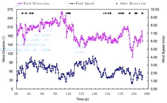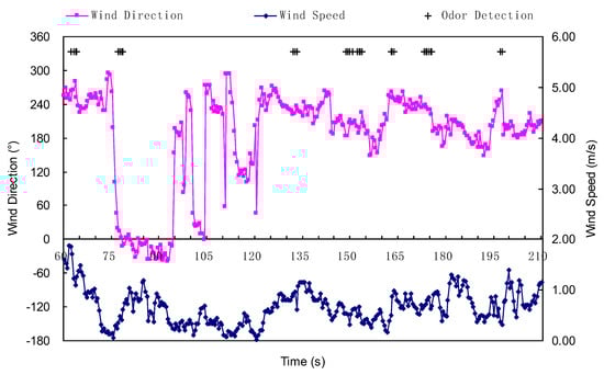 The detailed instantaneous speeds/directions of airflow and detection events of the chemical patch are shown in Figure 13, where the circular variance of the wind direction was 0.42, from which we can see that the wind direction changed much more frequently than that in the football field. The other obvious feature is that the wind speed was much lower than that for the F group. As mentioned above, this group of trials was conducted in a field surrounded by high buildings, and normally the wind speed in such areas is not very strong, and the wind direction tends to be capricious. The small wind magnitude and fast-changing wind direction resulted in worse uniformity of wind field, leading to lower searching performance.