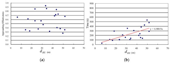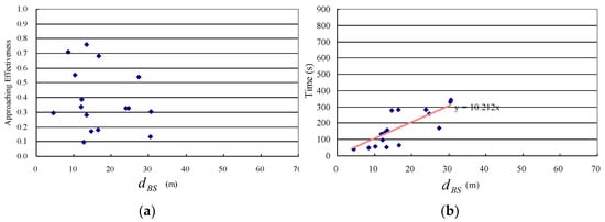 The experimental results for this trial group are illustrated in Figure 14, where the subgraphs (a) and (b) show the detailed information regarding approaching effectiveness and time cost for each trial, respectively. Overall, the success rate was 12/16 = 75.0%. The four failed trials’ approaching effectiveness was lower than the given threshold 0.2, which was due to two main reasons. One was the weak wind speed (less than 0.2 m/s) and capricious wind direction, the other was the large cumulative error of the robot’s self-localization using dead reckoning; the D-GPS module was not used, because it almost did not work in this environment, surrounded by high-rise buildings. The time cost was approximately 10.21 times that of , with an assumption that the time cost was a linear function of (ignoring the final distance ).
