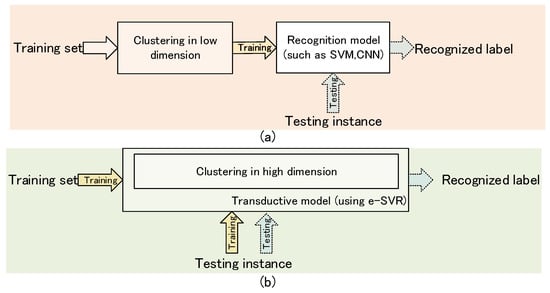 Comparison of the recent study and the proposed transductive model: (a) The flow diagram of the recent study, including the two main processes; (b) The flow diagram of the transductive model.