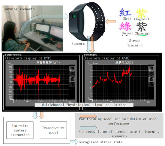 We also provided a framework for field studies in the learning scenario to explore the usability of the proposed model. The academic pressure and frustration, etc., of students lead to depression and anxiety, and therefore, it is necessary to adjust the teaching content or to provide psychological counseling based on the mental stress of the students. In our study, using the computerized approach of the interactive interface for learning English words, we established a real-time framework that could recognize the student’s stress state using peripheral physiological signals as shown in Figure 2. A self-established dataset was collected based on the Stroop Effect [26], with concurrent labels to train the recognition model. The main contributions of this work are fourfold: