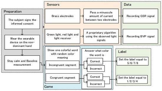The moment when each event occurred was recorded synchronously to help set the concurrent labels. Figure 4 shows the labeling process. The automatic labels’ definition was based on the difficulty level of the game and the consistency between the font color and word meaning. The congruent segment had a matching meaning and font color in the words, whilst the incongruent segment had a mismatched meaning and font color in the words. During the incongruent segments, the stress state presented by sympathetic activation might cause potential concurrent changes [44]. The period from the new incongruent segment shown to one key pressed, was set to the stress label (5/6/7/8). Shaomei et al. [45] found that stress increased significantly with the increasing difficulty of the game.