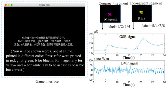 The “Stroop Effect” has proven the ability to inspire human mental stress, and there are many existing computerized interactive experiments based on this theory, such as in [42]. The interactive Stroop training was performed using peripheral physiological signals with concurrent labels, conducted on a personal computer (PC). The detailed experimental process was as shown in Figure 3.