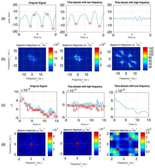 Similar to the BVP, the extremum of the original GSR signals cannot be used to calculate the current features. Real-time stress recognition requires high time resolution, so the sliding window should not be set too wide. However, a narrow sliding window may result in poor frequency resolution, which is not conducive to spectrum analysis. Therefore, in the first process, we used wavelet packet decomposition to obtain the low frequency and high frequency signals of both the BVP and GSR, as shown in Figure 6a,c. Amongst them, due to the different sampling frequency, two second windows could show the integral two or three fluctuations in the BVP, while in the GSR, the fifteen-second window size was selected to show the tonic activities. The advantage of using wavelet transform is to analyze non-stationary signals with obvious time-frequency local changes, which can effectively enhance the transient information hidden in the physiological signals. For the BVP signal, the low frequency signal better extracted the signal containing only the diastolic point and the contraction point, e.g., the red point in the time domain with low frequency in Figure 6a. For the GSR signal, the high frequency signal represented the rapid change of the SCR. Therefore, in the second process, using EVC, the peaks of the BVP could be obtained in low frequency and the peaks of the GSR could be obtained in the high and low frequency, respectively. In addition, the phase was used to determine the relative progress of one oscillatory cycle at a particular time. Owing to the translation invariant feature of the spectral amplitude, the lack of phase information increases the convergence between the heterogeneous targets, resulting in a decrease in the regression performance. Therefore, in the third process, we used bi-spectrum analysis to characterize its spectral features, as shown in Figure 6b,d. Finally, the list of extracted features and their descriptions are given in Table 1. The extracted features of GSR are divided into two types: high frequency and low frequency. Most of these features are not affected by baseline drift, except for the low-frequency high-order cumulants. And normalization we used can reduce the impact of baseline drift to the low-frequency high-order cumulants. For the DEAP dataset, the method of extracting the features was the same and only the sliding window size was changed.