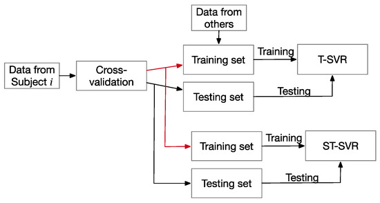 In order to address the above issues, a transductive model is proposed by combining transductive learning with clustering methods based on neighborhood knowledge in high dimension, as shown in Figure 1b. Specifically, the neighborhood knowledge refers to the continuous labels and the similarity measure in the feature space of nearby examples. Unlike the existing research, the clustering process was performed in the recognition model. Compared to inductive reasoning, the transductive learning [24], as the theoretical basis of the proposed transductive model, was more suitable for application, because it did not focus on the overall precision of the model but rather each individual case [25]. This satisfied the demand of physiological signals-based stress recognition. In the transductive learning, the test instances and training set interacted to determine the optimal subset, by which a particular local regressor can be constructed. The aim of the transductive model in this paper was not only the clustering but also the outliers’ exclusion, and finally to reduce the errors caused by the individual differences to improve the performance of the stress recognition. The transductive model adopted the epsilon-Support Vector Regression (e-SVR) to perform the prediction, which was divided into the specific transductive-SVR (ST-SVR) and the transductive-SVR (T-SVR), according to the source of the training set. In addition, the inherent homogeneity of the stress states of different individuals was also considered, and the prediction performance of the T-SVR (samples from all subjects) was compared to the performance of the ST-SVR (samples from one individual subject).