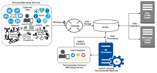 Information in the context of well-being is collected and transformed by connecting personal identities with mobile devices by the use of getaway of wireless nature. NoSQL [] is used to store data, which helps in integrating contextual information in two engines, profile engine and well-being content engine. Each technique focuses on different facets by the use of machine learning techniques. Hybrid learning methods give the content of a personalized recommender and are based on feedback of a reflecting nature. There are challenges in recommendation, which can be represented as the estimation of the response of a new user, choosing specific algorithms, learning mechanism, and the evolution of performance []. Well-being content supports recording routine activities and provides the recommender service usage. The handling of data requirements is done with communication of data sources in many aspects. There is integration of data related to the context of users and engines of well-being services.