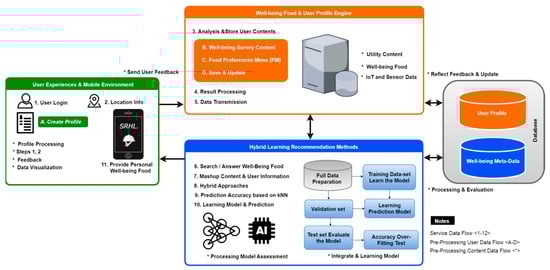 The learned preferences are used to further re-rank the recommendations presented to them. In the rest of this service model, depicting the process of the proposed methods, the first model is data acquisition, which involves collecting information as mentioned in steps 1 and 2. The second model service data flows from <1–12>, which can be transmitted and stored as preprocessed user data flow specified in <A–D> locally in well-being and the user profile engine. The third model is the hybrid learning methods required for preprocessing content data flow mentioned in <*> using ML to train and test the dataset to evaluate the learning production model to improve the accuracy over the hybrid filtering test and preserve the results based on k-nearest neighbors for the classification algorithm, and the results are presented and discussed in the next section. The recommendations will provide more appropriate suggestions according to the user’s targeted preferences based on a reflected user feedback loop. Well-being content is combined to define a care fusion type. Well-being Health food service paradigm and metadata contents are determined in order to construct a food preference menu. It also receives and analyzes users’ demographic, health, and personal information to create profile-authoring technology through the proposed service model.