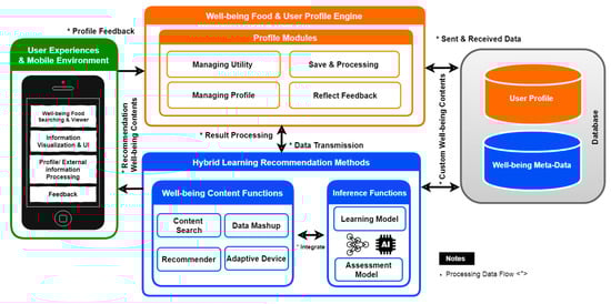 As discussed in the previous section on the SRHL, the proposed system architecture is shown in Figure 3, and consists of three main models, user experiences in the mobile environment to create a user profile, then data processing into profile modules that can manage utility, save and leading profile and reflect user feedback. The hybrid learning method consists of well-being content and inference functions for learning and assessment of the production model to better match the needs. Hybrid learning methods customize well-being content to recommended learning methods due to its process predication accuracy using feedback loop classification. An overview primarily comprises well-being complex content-authoring technology with the architecture design based on the available IEEE standard options []. The Software Requirements Specification (SRS) provides the basic guidelines for the proposed system. The architecture follows standards that include functional and nonfunctional requirements. The learning methods in inference functions are based on the k-nearest neighbor algorithm to process preferences in user rating scores and ranking of food content []. In the next step, the recommendation engine provides users with optimal recommendations based on the functions of the learning methods according to their feedback loop and preferences. Figure 3 shows the specific technologies required for each component.