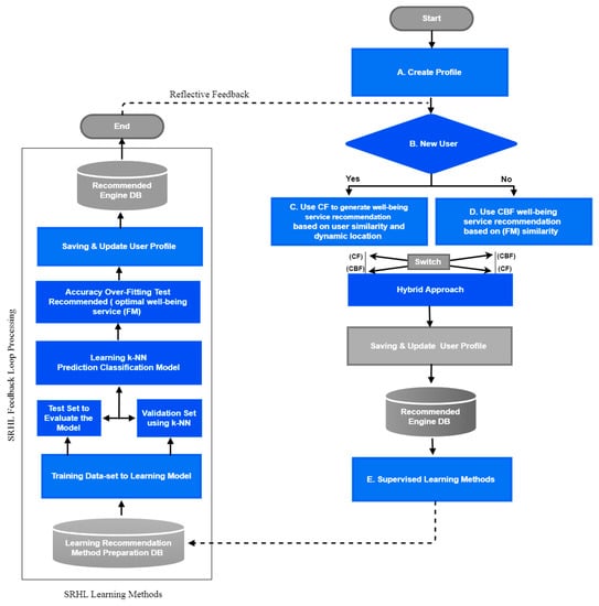 The core idea behind SRHL processing is to compute the similarity index between users and well-being content by analyzing user profiles and learning methods from feedback loop to mash-up using the new optimized recommender in a mobile environment. The learning methods assessment flowchart, shown in Figure 4, consists of multiple functions that will be described below. Table 1 contains the specific proposed method parameters, which assign different value definitions to explain the processing of the algorithm.
