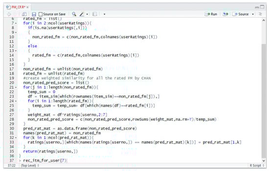 R language is a powerful tool for data analysis and prediction []. R Studio, an integrated development environment, is compatible with various filtering and analysis libraries such as CF, CBF, ML, and similarity []. The libraries and functions used in these experiments are shown in Table 5, and a screenshot of the operation code part of the recommendation models is shown in Figure 6 and Figure 7, with the results using three matrix error models (MAE, MAPE, and MSE) for evaluating the recommendation results.