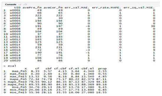 The code shown in Figure 6 is part of the source code for the CF model of the proposed SRHL, and the console screen in Figure 7 shows the results of MAE, MAPE, and MSE in R. These 20 data points are the result of recommendation results of users and the error values/rates to calculate MAE, MAPE, and MSE when FM = 10. <avePre_fm> is a predicted recommendation result, and <aveCor_fm> is a correct recommendation result. <err_val.MAE.> is a result calculated by the difference between <avePre_fm> and <aveCor_fm>, which is the error values of users. <err_rate.MAPE.> is an error rate for calculating the accuracy through MAPE, which is 1 if there is an error and 0 otherwise. <err_sq_val.MSE.> is a squared error value for calculating MSE. In Figure 6, the matrix <eval> is derived from six models by calculating the average and frequency of the total results and deriving the final analysis results. The final results are analyzed and summarized in Table 6, Table 7, Table 8, Table 9 and Table 10, and visualized in Figure 8, Figure 9 and Figure 10.