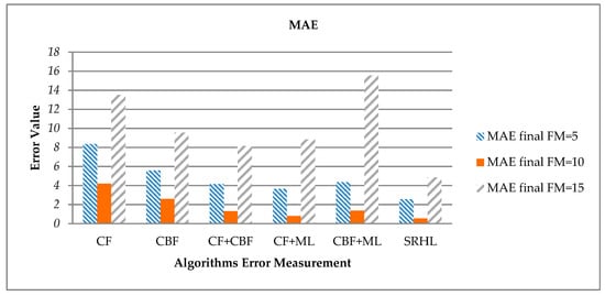 FM is a recommendation list that is derived in CF which is the first step in the proposed algorithm for the recommendation. FM decreases in every step of the algorithm because each step deletes 10 useless items. The final numbers are FM-5. It is essential to know the performance of the SRHL after the experiment to find out if the methods have been successful or not. Many properties can be considered when evaluating the recommendation system. The learning methods’ performance can be measured by testing against different datasets using a machine learning method approach and then comparing the performance of the four algorithms (CF + CBF, CF + ML, CBF + ML, CF + CBF + ML) that use these models to calculate accuracy. The first method is used for collaborative filtering (CF) and content-based filtering (CBF), then two algorithms combined (CF + CBF) are applied to CF + ML, then CBF + ML is combined with the final proposed learning method, and then all algorithms (CF + CBF + ML) are combined to forecast the exchange rates. This way, the proposed methods of SRHL calculate the accuracy and reliability of the performance comparison according to three evaluation criteria matrix error [].