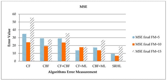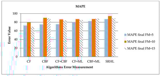 According to the results, the lowest error value was observed when FM = 10, which showed good results as with MAE. The proposed SRHL showed the lowest error value of 6.85 and the highest error value of 24.06 in CF as well as MAE and MAPE. The proposed SRHL improved the error value by an average of 12.87 over all models when FM = 10. The error value was improved by 17.21 compared to CF, with the highest error value of 24.06, and by 7.03 from 13.88 for CBF+ML, which is the next lowest error value for the proposed SRHL.