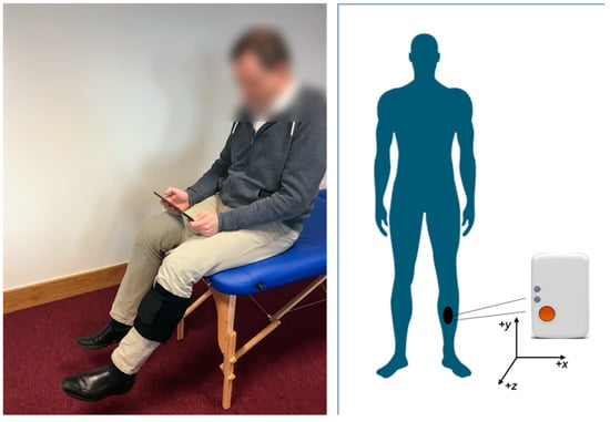 The prototype system evaluated by all participants consisted of a single wearable IMU (Shimmer, Dublin, Ireland) [], and a tablet computer with a custom-built Android application. The Shimmer3 IMU, utilising a tri-axial low-noise accelerometer (±2 g) and tri-axial gyroscope (500 °/s) configured to sample at 102.4 Hz, was placed at the midpoint of the anterior aspect of the shin in a neoprene sleeve, and streamed data via Bluetooth to the tablet whilst the user was guided through their exercises (Figure 1). An avatar mirrored the movements of the user in real-time, the repetitions were counted (Figure 2), and at the end of each exercise, the user was given advice on their technique based on supervised machine learning.