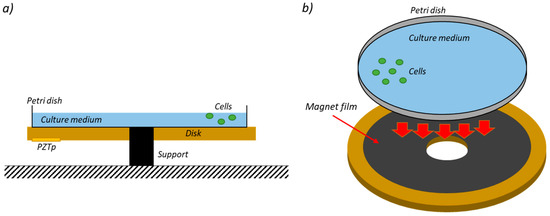 The sketch of the planned vibrating bioreactor is shown in Figure 1. As can be seen in this figure, the bioreactor is based on a disc with a petri dish over the disk surface. The culture medium with the cells is inside the petri dish, which is installed by means of a magnet film. This allows the petri dish to be removed easily from the disc for examining the cells after each vibration cycle.