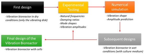 The methodology to develop the proof of concept of the vibration bioreactor is shown in Figure 2. An initial design of the bioreactor in dry conditions was experimentally tested. The experimental set-up was based on a disc instrumented with a PZTp. The disc was excited with this PZTp and its vibrational response was measured with a laser Doppler vibrometer (LDV), as well as with an ultrasound sensor. With this experiment, the natural frequencies, mode-shapes, and damping of the disc could be obtained, as well as the vibration amplitudes in different frequency ranges. After that, a numerical model was built. The numerical model simulated the same conditions as in the experimental test. The numerical model can be calibrated and validated according to the experiment for predicting the vibration amplitudes and vibration shapes of the disc. The bioreactor will also be tested in wet conditions with the petri dish containing the culture medium. Results obtained at this stage will be used to achieve the final design of the vibration bioreactor.