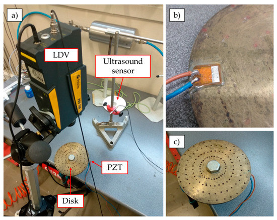 (a) Picture of the experimental set-up; (b) detail of the piezoelectric patch (PZTp); (c) detail of the disc.