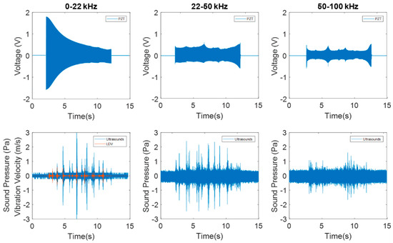Time signal of the PZTp excitation and the responses of the laser Doppler vibrometer (LDV) and ultrasound sensor for the three different ranges of excitation tested.