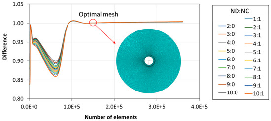 Firstly, a sensitivity analysis of the mesh was carried out. The sensitivity analysis ensured that the results obtained were independent of the element size. For this purpose, the size of the elements was decreased until numerical results obtained in Abaqus were independent of the mesh’s coarseness. Natural frequencies were compared between the set of FEM meshes (for frequencies less than 100 kHz). The mesh selected had 1.3 × 105 elements with an element size of 0.8 mm. The mesh sensitivity analysis and the optimal mesh are shown in Figure 6.