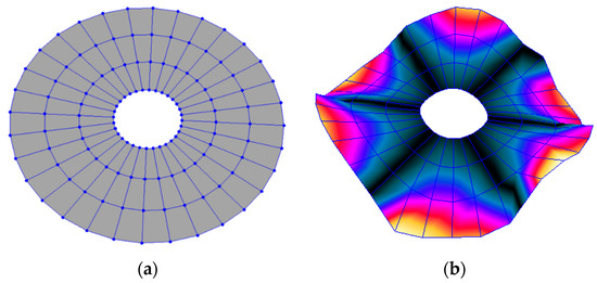 (a) Geometry for the operational deflection shape (ODS); (b) example of a mode-shape of the disc obtained using the ODS.