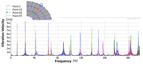 In the analyzed range from 0 to 22 kHz, there were multiple natural frequencies of the disc. Figure 8 shows the fast Fourier transform (FFT) of four different points in different radii of the disc. Multiple peaks can be observed within this range. It can clearly be seen that the difference in amplitude between in-resonance conditions (a natural frequency peak) and out-of-resonance conditions was substantial. Making good use of this variation was key to the bioreactor prototype design. The ODS representation permitted the experimental association of each natural frequency with one mode-shape.