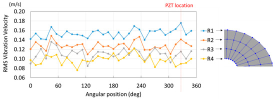 As shown in Table 1, the first 10 nodal diameters without nodal circles were found within the frequency range of 0–22 kHz. Only five nodal diameters with one nodal circle were found within this range. This means that the maximum deformation of the disc was located close to the edge of the disc. This finding was of great importance for the bioreactor prototype design. To check that this was true, the energy of vibration at each point could be calculated as the root-mean-square (RMS) value within the studied frequency range. Figure 9 shows the RMS vibration velocity in the range 0–22 kHz of all points measured on the disc and classified by their angular position. It can clearly be seen that the energy was concentrated in the exterior radius of the disc (R1 in Figure 9). Therefore, the optimal position for the cell’s location to obtain maximum vibration energy will be at the external edge and near the PZTp location.